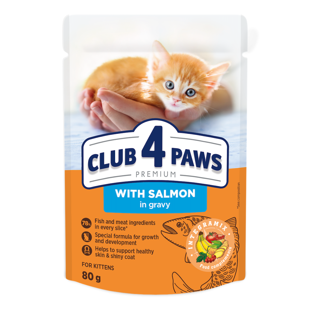CLUB 4 PAWS PREMIUM PENTRU PISOI "DIVERSE SORTIMENTE ÎN SOS". HRANĂ CONSERVATĂ COMPLETĂ. Hrana umeda Premium conține 77% carne și o formulă specială de creștere cu un conținut ridicat de carne (32%) pentru o creștere sănătoasă în primele 12 luni de viață. Echilibrul fosforului, calciului și vitaminei D contribuie la formarea oaselor și articulațiilor sănătoase. Complexul de acizi grași Omega 3 + Omega 6 menține pielea sănătoasă și blana strălucitoare. Hrana este îmbogățită cu formula unică INTEGRAMIX pentru susținerea generală a sănătății și imunității animalului de companie.